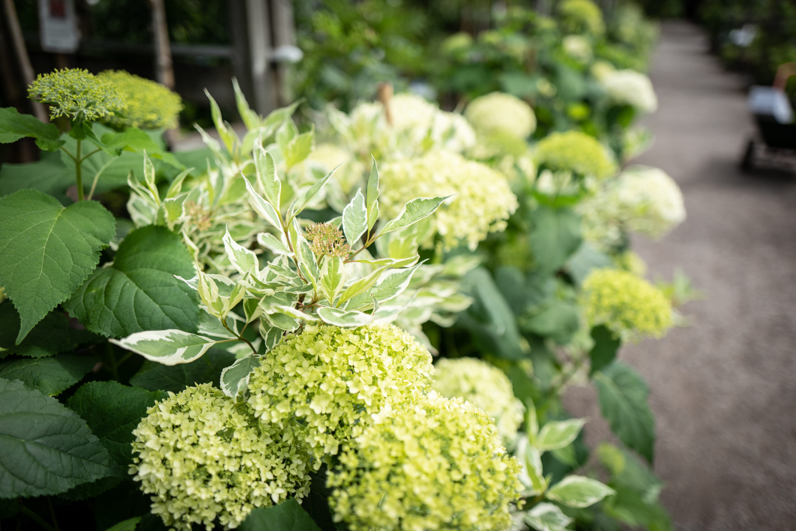 Hortensia(ホーテンシア)。紫陽花。アナベルという名を持つ種類。白の他にピンクやルビーもある。一つ一つの花弁(正確にはあれは<がく>らしい)が他のアジサイに比べて小さく、大きくて丸いふさになるのが特徴。友人宅で一目惚れした種でぜひ生垣にしたい。注:ちなみに中央に写っているのはサンゴミズキの一種です。