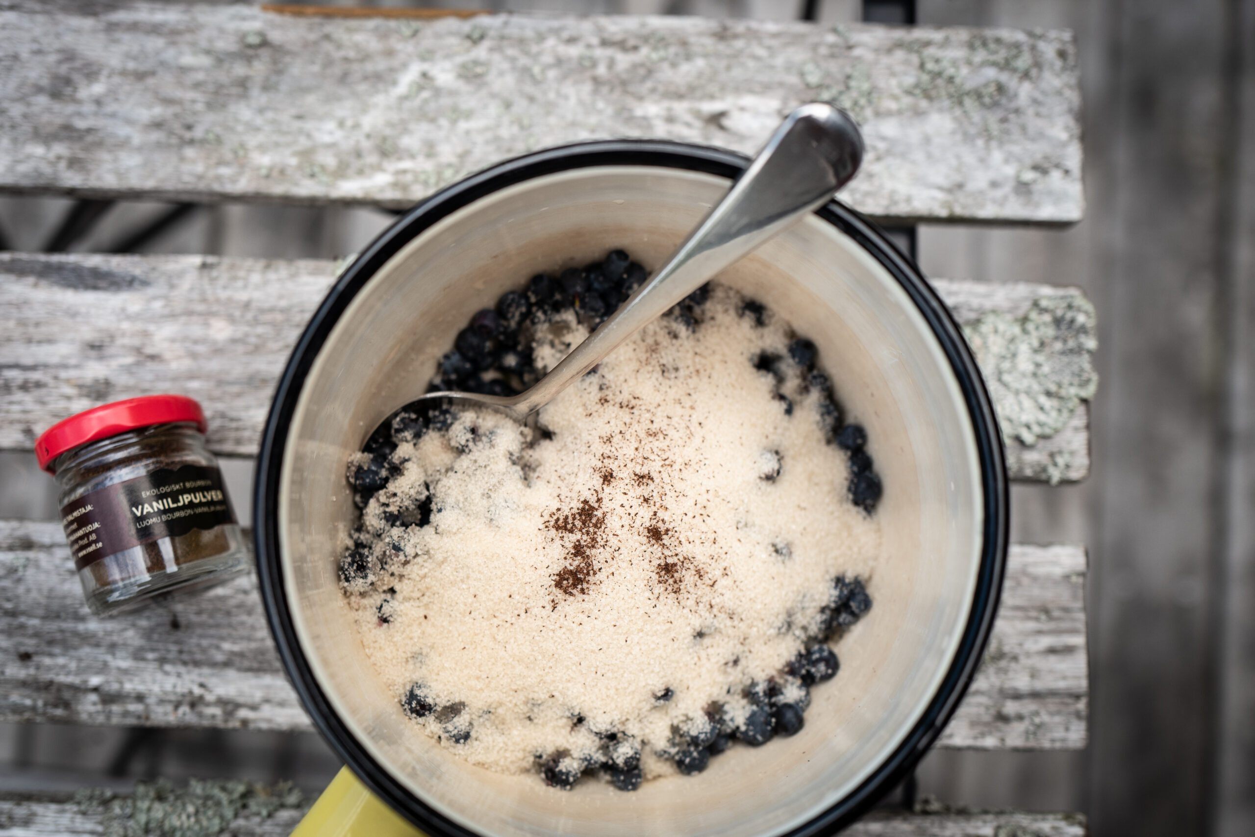 さて、採ったブルーベリーはすぐジャムにしましょう(たくさんたくさん採れると冷凍したりしますが)。保存や見栄えを考えれば、それに合わせたきちんとしたレシピがおすすめですが、あっという間に食べ終わってしまう量ですし、ほとんど何も気にせず、僕がやることは以下の手順だけ。