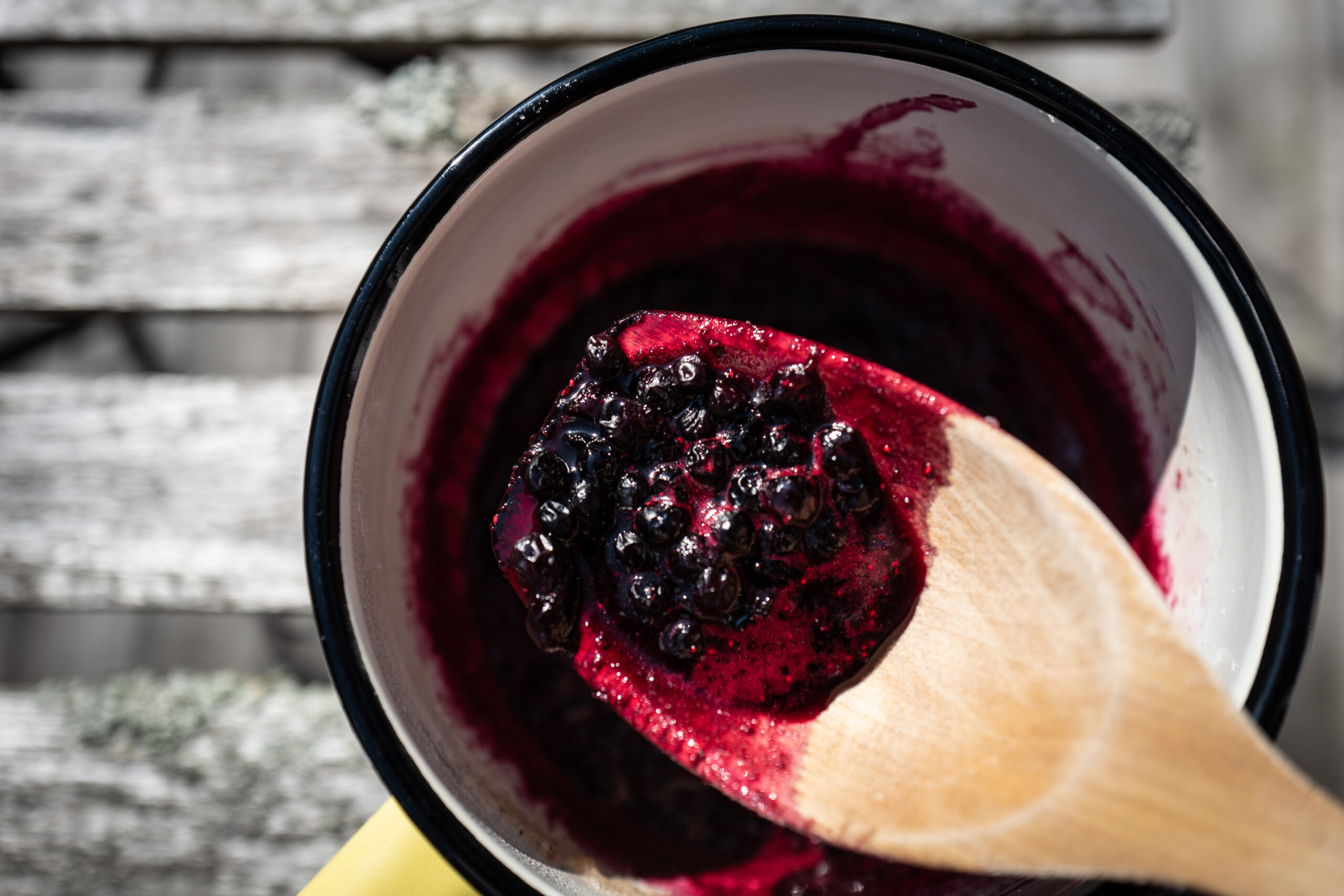 そうそう、どうしてブルーベリーっていうのかと思ったことありませんか。摘んでいるときの指先は赤紫。火にかけている時の木べらも美しい紫色にそまるのに。