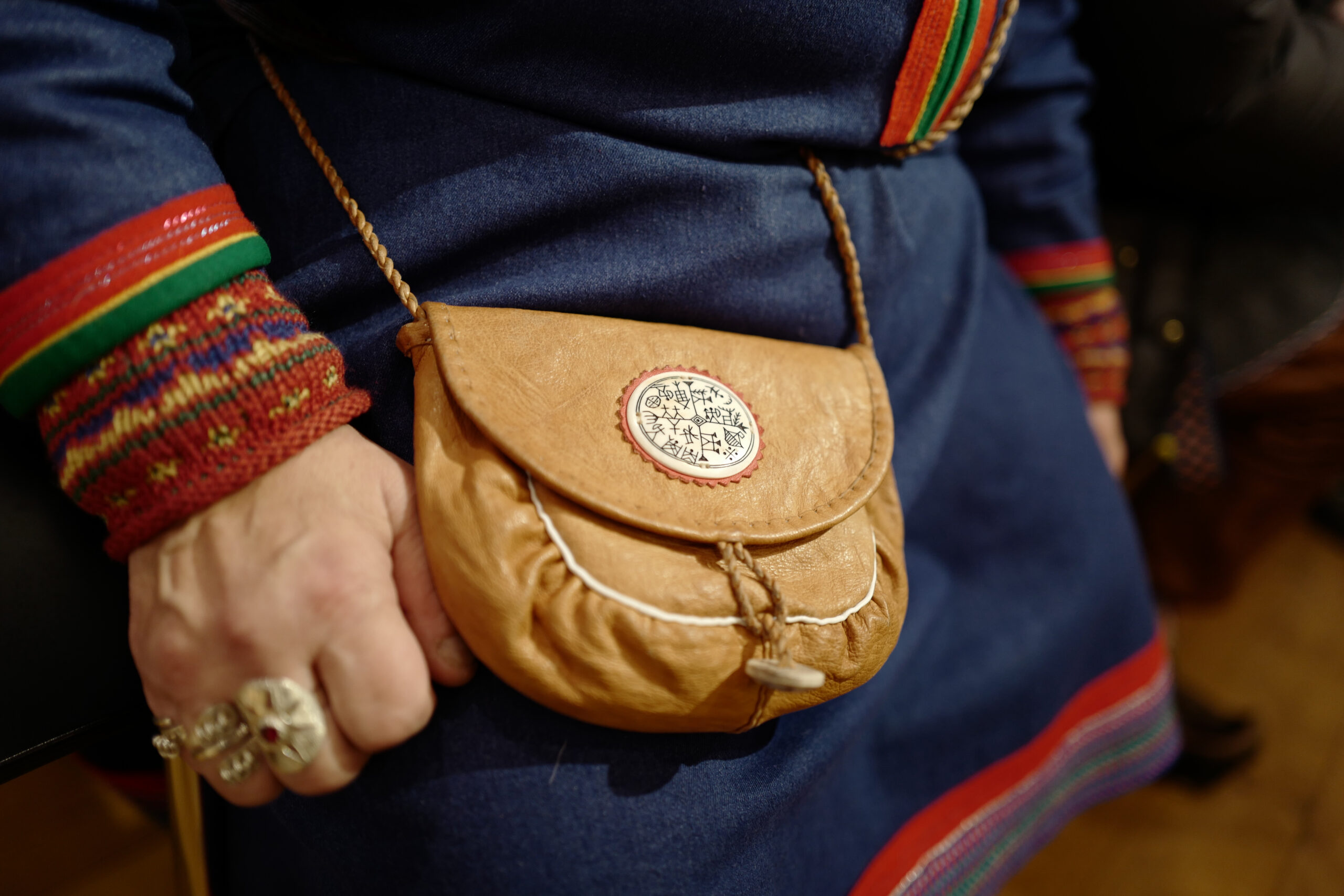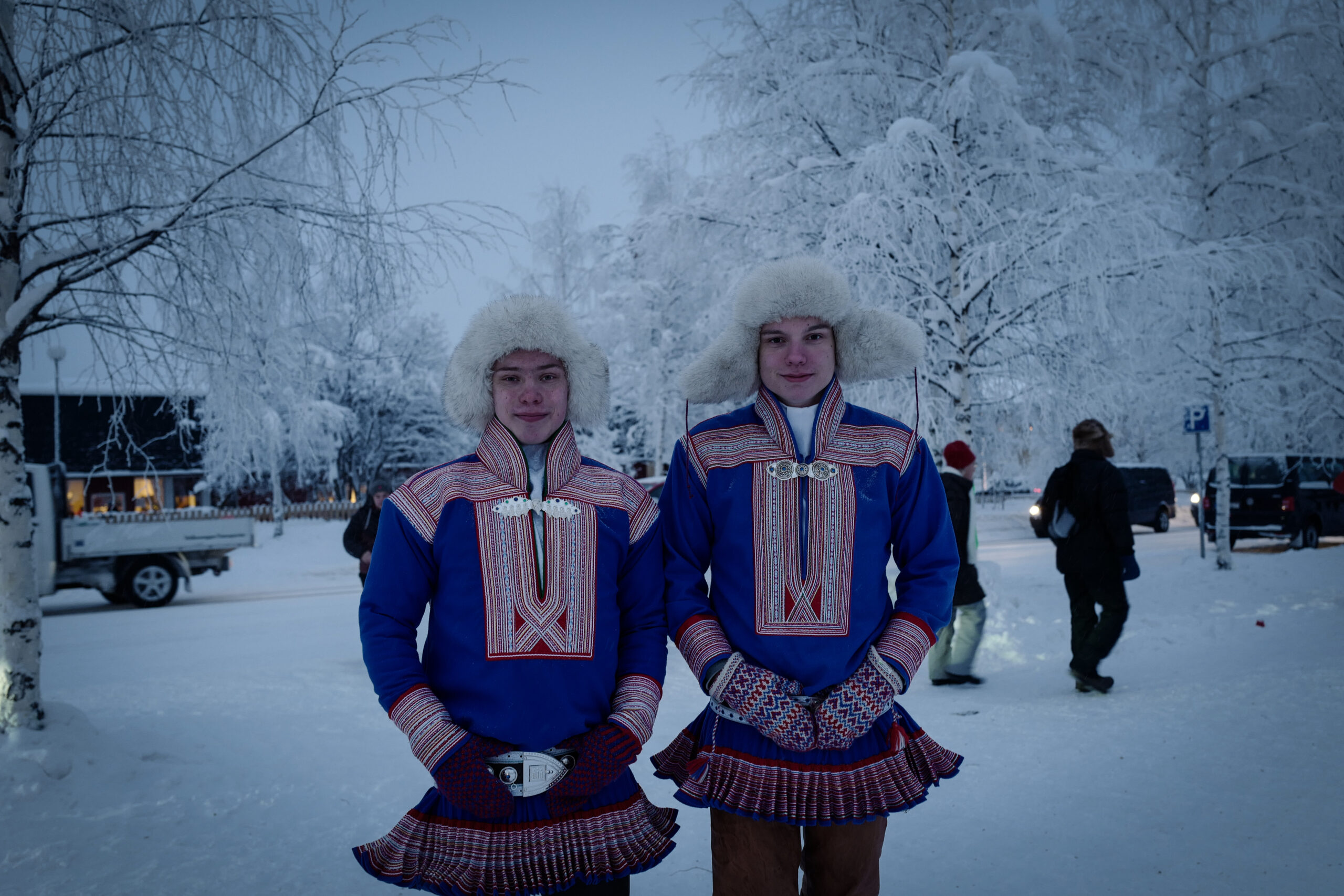 トナカイの肉や毛皮、コーヒーに入れて食べるチーズ、サーミの手工芸などを見ながらマーケットを歩くと、民族衣装(コルト)に身を包む人々とすれ違う。それぞれの地域ごとに特色があり、お互いにどの場所出身かがわかるのだという(男性ふたりの写真はKautokeino村)。青白くかがやく世界で見るコルトの美しさに目を奪われる。