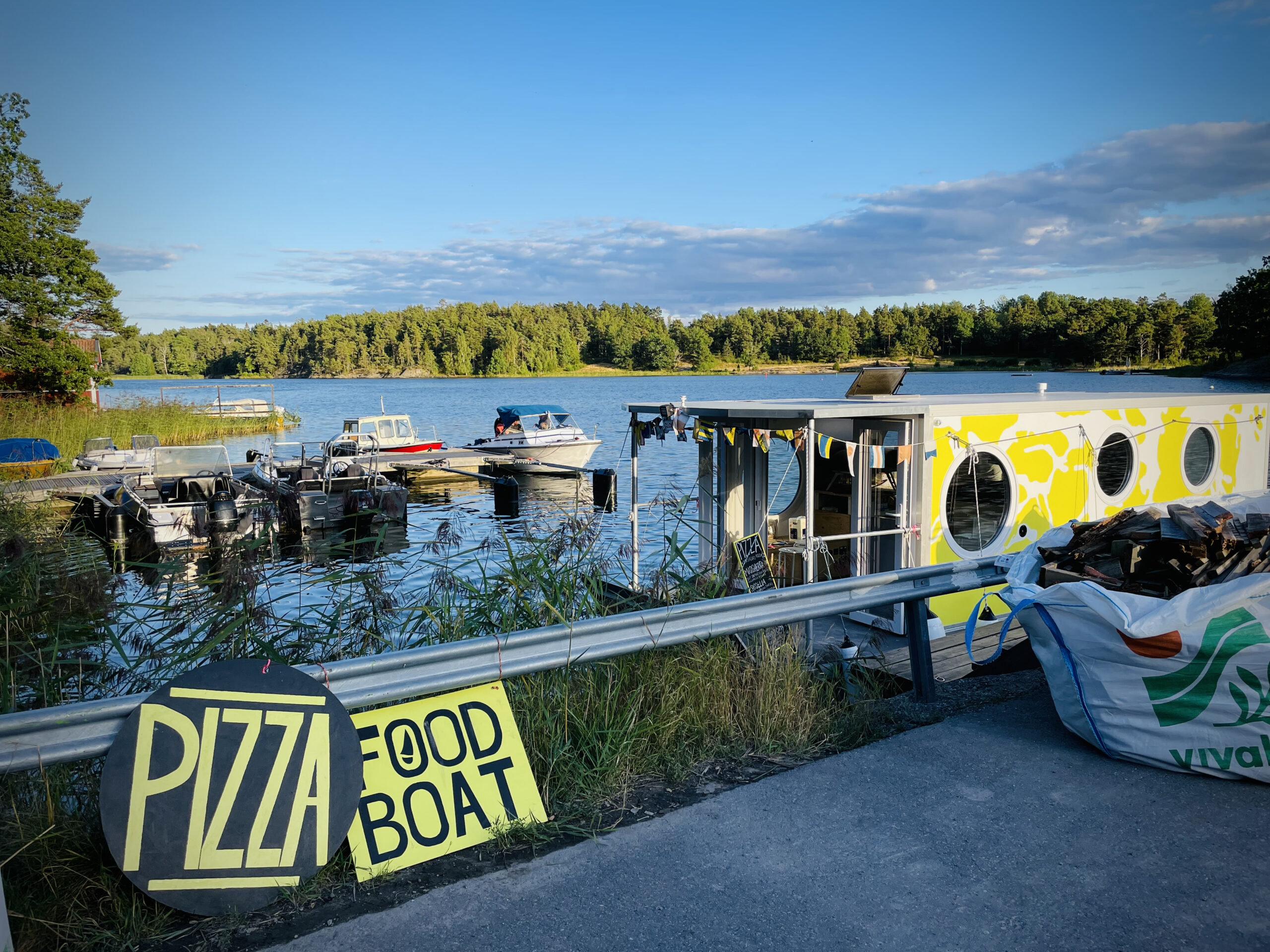 うちの近所にあらわれた移動式ボートピザ屋さん。常設ではなくFacebookでドコドコにあらわれますよ、の告知をしているのですが、味のおかげか物めずらしさのおかげか、はたまたこの日の空模様がよかったからなのか、僕らが行ったときにはすでに完売。右手に写っているのは釜焼き用の薪とのことで、なんでも古くなった桟橋の材木を利用しているのだとか。群島地域ならではですね。