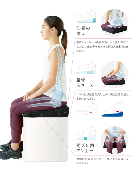 ハード面が背骨の支えとなる仙骨を後ろから支え、ソフト面が座骨を受け止めて、お尻全体を包み込んで支えるため安定感があります。