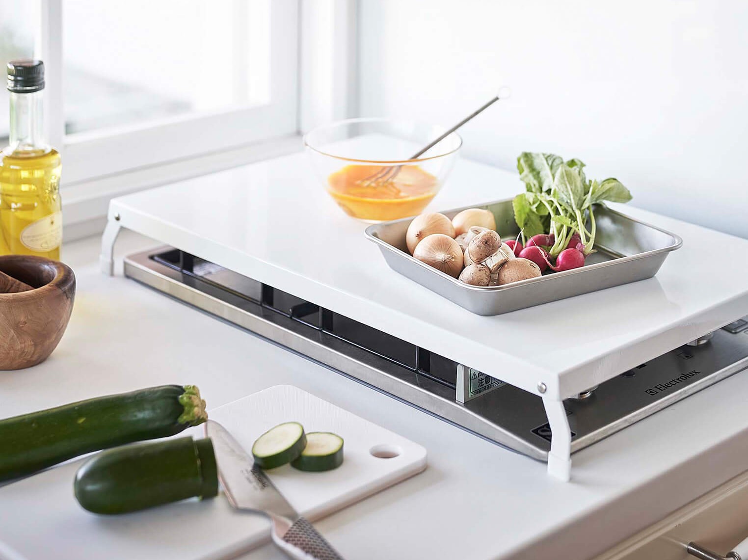 ガスコンロカバーを置くことで、火を使わないときのコンロが作業スペースとして利用できます。