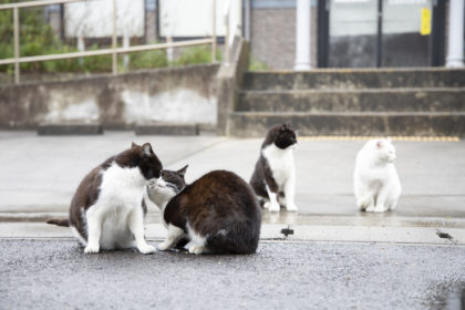 猫のあいさつは鼻と鼻をちょんと突き合わせるのがお約束。 ラブラブにあいさつをしている二匹の後ろで「見てませーん」と言わん...
